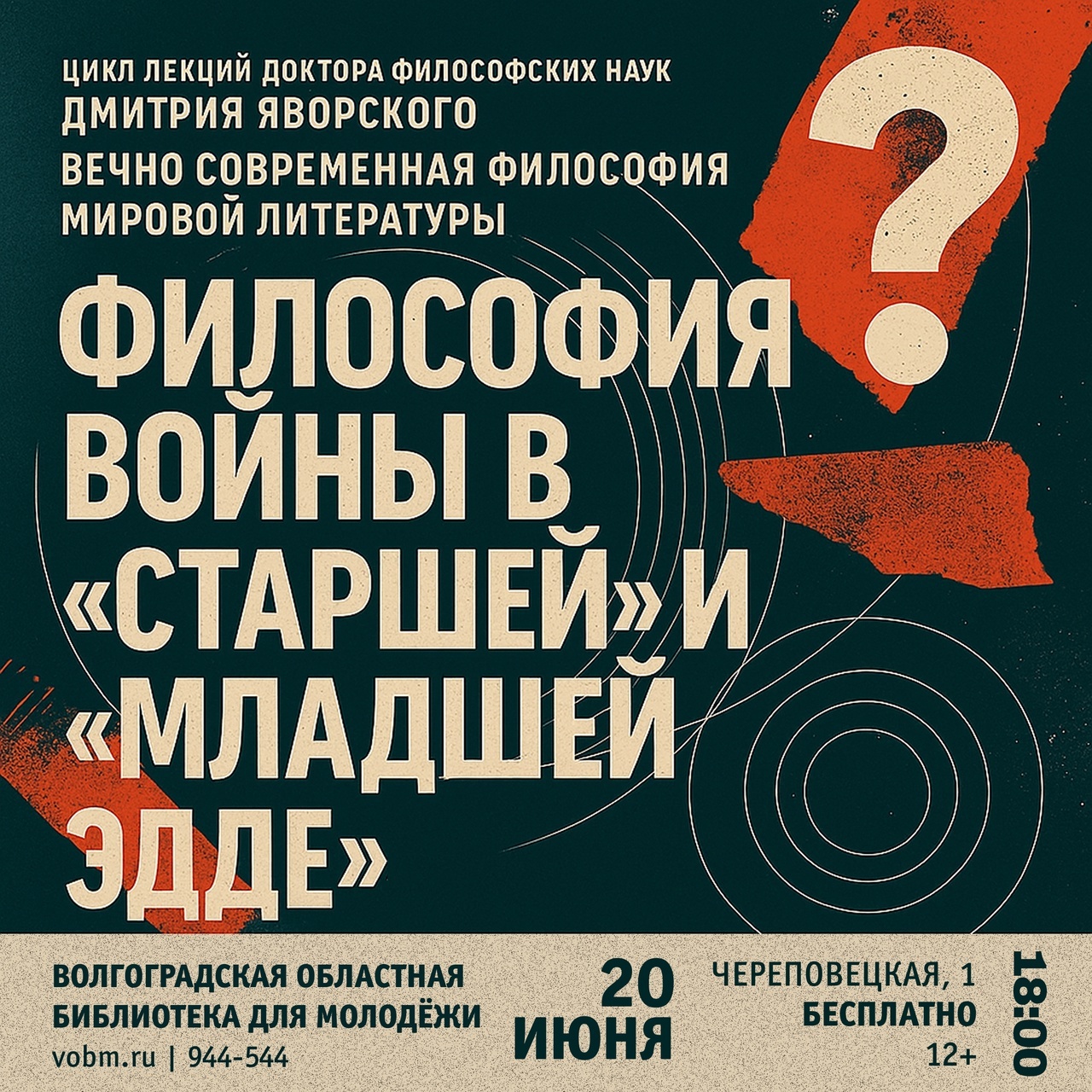 Волгоградская областная библиотека для молодёжи (ул. Череповецкая, 1) приглашает 20 июня в 18:00 на лекцию «Философия войны в "Старшей" и "Младшей Эдде"».