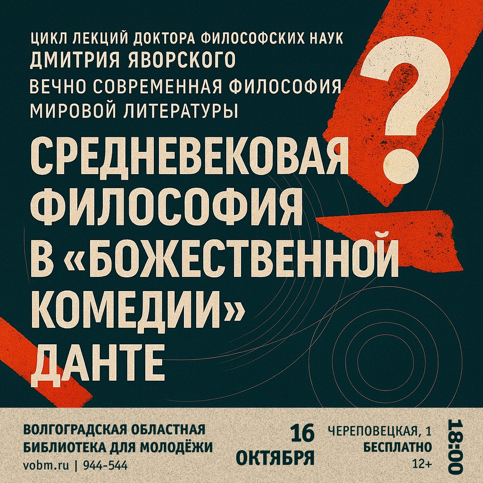 Волгоградская областная библиотека для молодёжи (ул. Череповецкая, 1) приглашает 16 октября в 18:00 на лекцию «Средневековая философия в «Божественной комедии» Данте».