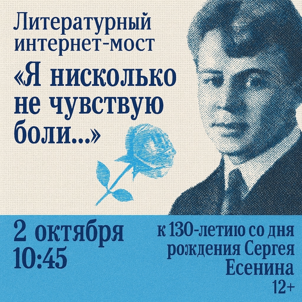 2 октября в 10:45 Волгоградская областная библиотека для молодежи приглашает своих читателей на встречу «Я нисколько не чувствую боли…», посвященную 130-летию со дня рождения Сергея Есенина.