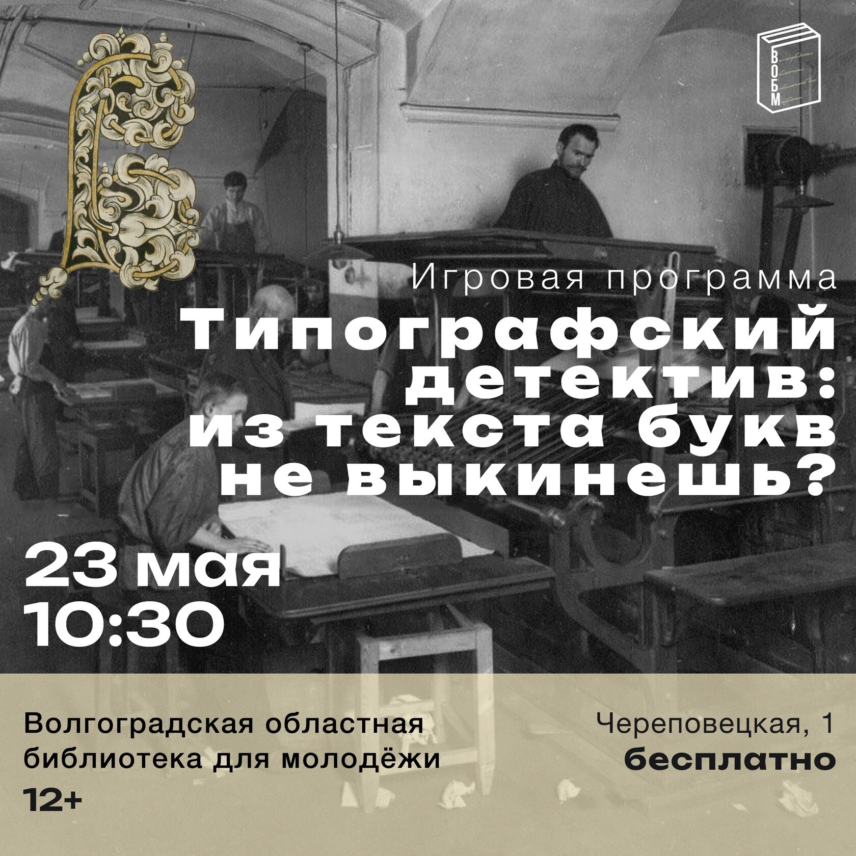 23 мая в 10:30 гостям Волгоградской областной библиотеки для молодёжи предстоит попробовать себя в роли типографских детективов! Участники игровой программы «Типографский детектив: из текста букв не выкинешь?» отправятся в увлекательное путешествие по истории русского языка и письменности.