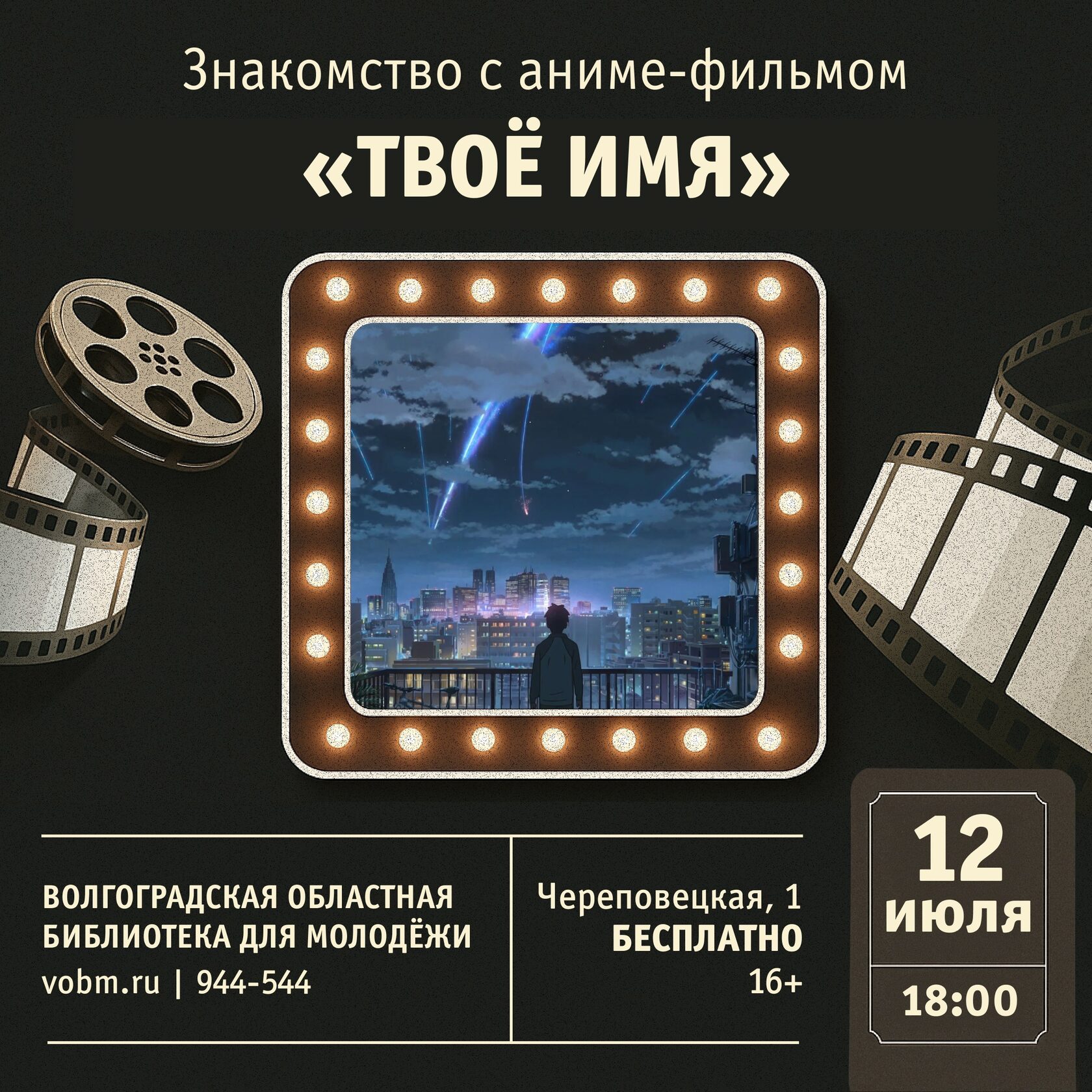 12 июля в 18:00 в Волгоградской областной библиотеке для молодежи в рамках проекта Зеркало сцены состоится знакомство с аниме-фильмом Макото Синкая «Твое имя».
