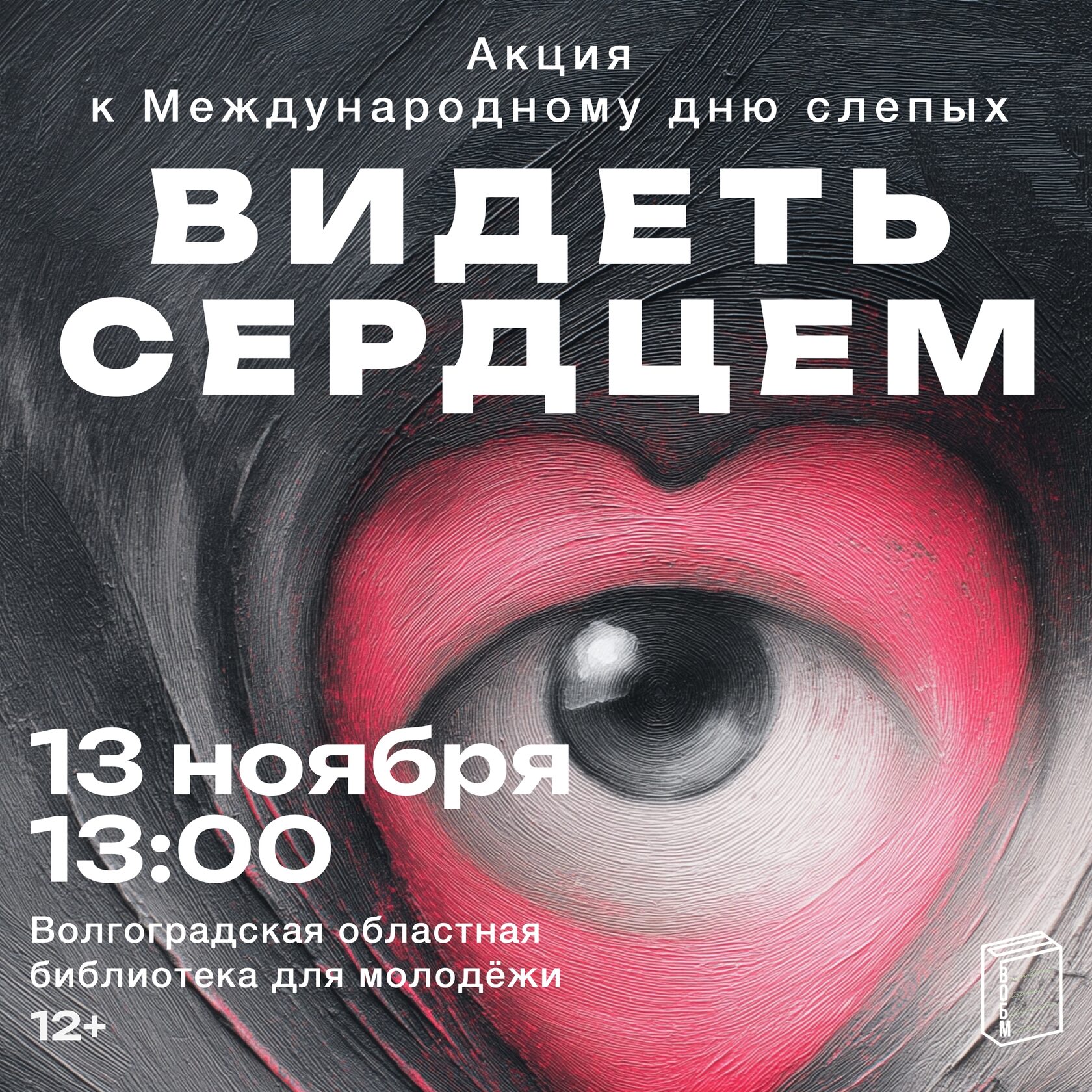 13 ноября 13:00 в Волгоградской областной библиотеке для молодёжи пройдет акция «Видеть сердцем», приуроченная к Международному дню слепых. В этот день во многих культурных пространствах проходят лекции и тематические вечера, посвящённые различным проблемам зрения. В медицинских центрах также проводятся профилактические мероприятия, направленные на предупреждение болезней глаз.