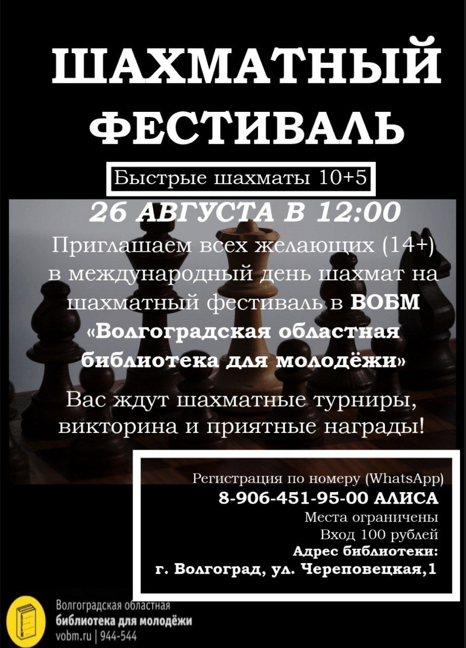 26 августа в 12:00 на площадке Волгоградской областной библиотеки для молодёжи пройдёт очередной шахматный фестиваль, организованный клубом любителей шахмат «Шах Аль Мат».