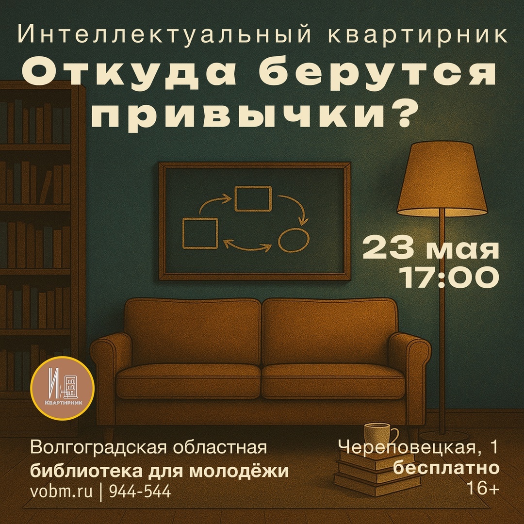 23 мая в 17:00 в Волгоградской областной библиотеке для молодежи состоится очередная встреча студенческого клуба Интеллектуальный квартирник. Тема встречи: «Откуда берутся привычки?».
