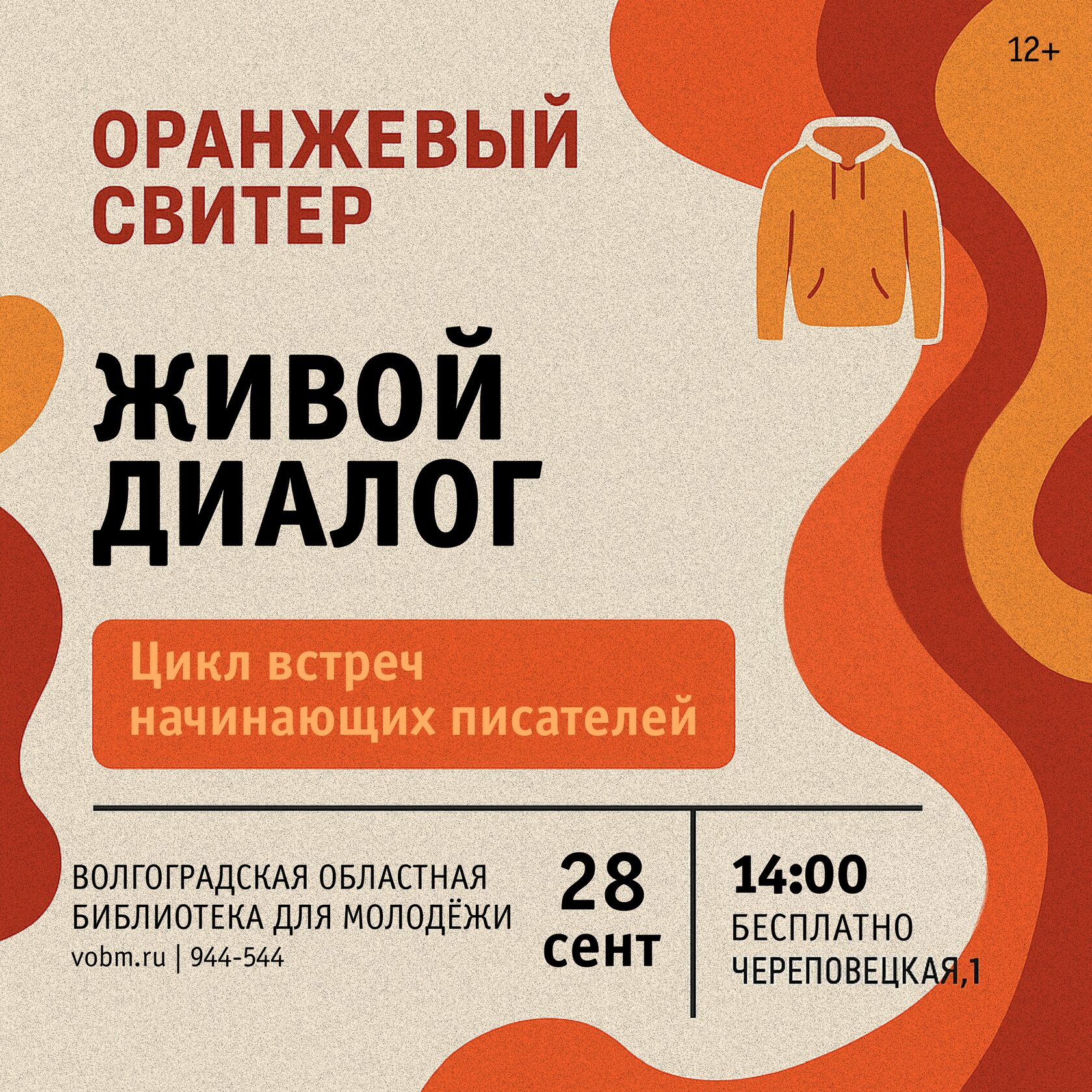 28 сентября в 14:00 в Волгоградской областной библиотеке для молодежи состоится очередная встреча в рамках цикла встреч начинающих писателей «Оранжевый свитер». Тема: «Живой диалог».